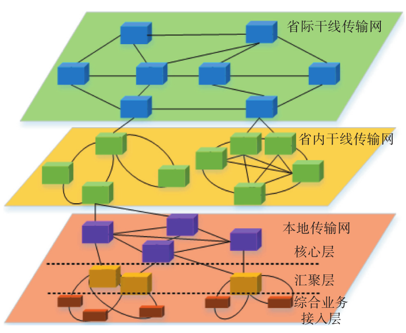 經(jīng)過多年的發(fā)展,傳輸網(wǎng)絡(luò)已經(jīng)形成了穩(wěn)定的省際干線、省內(nèi)干線、本地傳輸網(wǎng)三級架構(gòu),本地網(wǎng)又分為核心層、匯聚層、綜合業(yè)務(wù)接入層,層級間通過1~2 個節(jié)點銜接,如圖1所示。