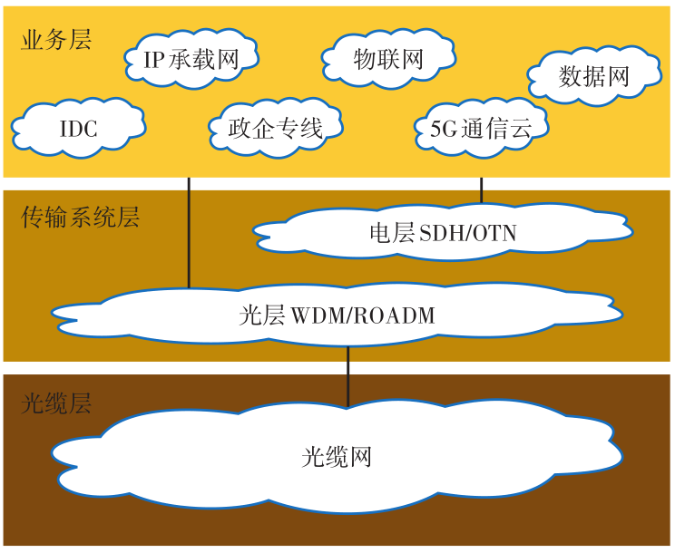 從承載邏輯上,每一層級網(wǎng)絡(luò)又可以分為光纜層、傳輸系統(tǒng)層,傳輸系統(tǒng)層又分為光層和電層,下層與上層屬于服務(wù)與被服務(wù)的關(guān)系,光纜為光層提供纖芯,光層為電層提供波道,如圖 2 所示,本文討論范圍為傳輸系統(tǒng)層。