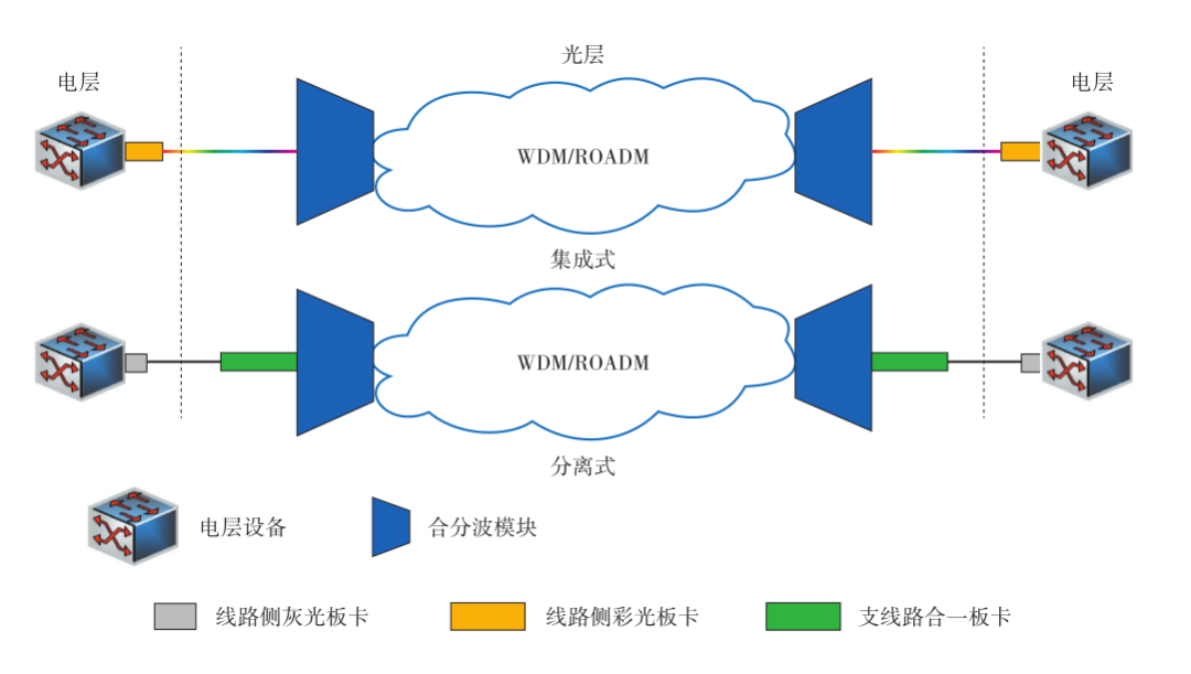 電層和光層的銜接模式有集成式和分離式2種。集成式即電層和光層采用同廠商設(shè)備,電層設(shè)備將業(yè)務(wù)整合成波長級后,通過線路側(cè)板卡直接進入光層的合分波模塊。分離式即電層和光層采用異廠商設(shè)備,受制于光網(wǎng)絡(luò)封閉的特性和現(xiàn)狀,異廠商電層和光層設(shè)備互通困難,分離式需要電層設(shè)備將小顆粒業(yè)務(wù)交叉整合后,通過線路側(cè)灰光板與光層設(shè)備對接,光層設(shè)備將其調(diào)制成彩光后再進入合分波模塊,如圖3所示。