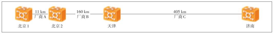 省際干線傳輸網(wǎng)因為覆蓋范圍廣、線路距離長,光層采用點對點WDM 方式分段建設(shè),通常在網(wǎng)絡(luò)建設(shè)時將波道資源規(guī)劃預(yù)留好,如須變更,就需人工現(xiàn)場跳纖,業(yè)務(wù)調(diào)度極不靈活。而且受制于傳輸網(wǎng)絡(luò)的封閉現(xiàn)狀,不同廠商的設(shè)備不能自由互通,如果業(yè)務(wù)途經(jīng)的系統(tǒng)屬于不同廠商,業(yè)務(wù)就需要落地轉(zhuǎn)接,既浪費投資,又增加傳輸時延。圖4所示為一條北京1節(jié)點到濟南節(jié)點的業(yè)務(wù),因為途經(jīng)的3個系統(tǒng)屬于不同廠商,需要占用6塊支線路合一板卡,而實際北京1節(jié)點到濟南節(jié)點的距離僅576km,以目前的技術(shù),業(yè)務(wù)完全可以在光層直接穿通,僅占用2塊支線路合一板卡。