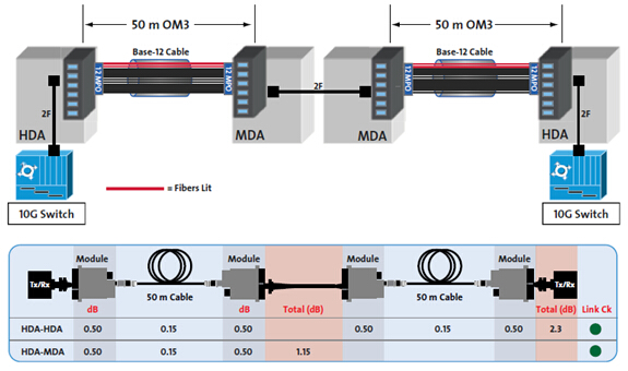 在這個(gè)例子中,兩個(gè)50米鏈路從MDA到HDA的連接,部署10G交換機(jī),損耗的計(jì)算是從HDA到MDA以及HDA到HDA的。然后損耗與表2進(jìn)行對(duì)比,在這種情況下,10G網(wǎng)絡(luò)的兩個(gè)鏈接最大損耗應(yīng)低于2.6 dB(圖8)。