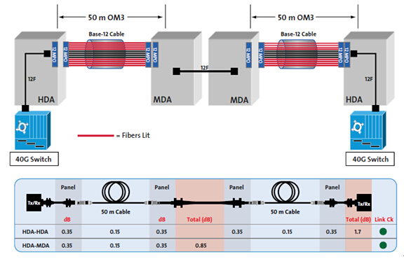 隨著網(wǎng)絡(luò)遷移到40G,鏈路損耗要求更加嚴(yán)格。在這個(gè)例子中,兩個(gè)50米鏈路從MDA到HDA鏈接,部署40G交換機(jī),損耗的計(jì)算是從MDA到HDA,以及HDA到HDA。然后損耗與表2進(jìn)行對(duì)比。在這種情況下,使用OM3光纖的40G網(wǎng)絡(luò),兩個(gè)鏈接最大損耗應(yīng)低于1.9 dB(圖9)。
