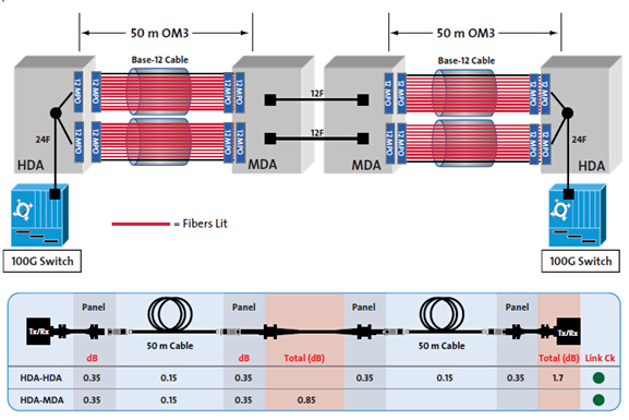 隨著網(wǎng)絡(luò)遷移到100G,鏈路損耗的需求跟40G是一樣的。在這種情況下,兩個(gè)50米鏈路從MDA到HDA連接,部署100G交換機(jī),損耗計(jì)算是從MDA到HDA,以及HDA到HDA,然后損耗與表2進(jìn)行對(duì)比。在這種情況下,使用OM3光纖的100G網(wǎng)絡(luò),兩個(gè)鏈接最大損耗應(yīng)低于1.9 dB(圖10)。