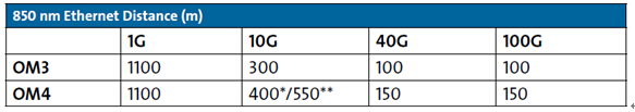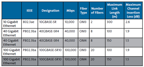 表1:OM3和OM4以太網(wǎng)標(biāo)準(zhǔn)規(guī)定的距離