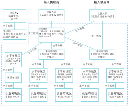 在數(shù)據(jù)中心被推薦的布線基礎(chǔ)設(shè)施部署是基于TIA-942指導(dǎo),“數(shù)據(jù)中心電信基礎(chǔ)設(shè)施標(biāo)準(zhǔn)。”利用分布式星拓?fù)鋵?shí)現(xiàn)結(jié)構(gòu)化布線,提供最靈活和可管理的基礎(chǔ)設(shè)施?,F(xiàn)今許多數(shù)據(jù)中心部署利用TIA-942規(guī)范減少拓?fù)?,水平布線區(qū)(HDAs)被整合進(jìn)主布線區(qū)(MDA)。在這個(gè)整合架構(gòu)中,布線被安裝在MDA和設(shè)備布線區(qū)之間(圖3)。