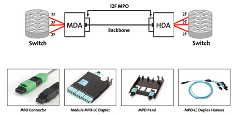 工廠預(yù)端接MPO的解決方案允許通過一個(gè)簡(jiǎn)單的即插即用系統(tǒng)實(shí)現(xiàn)連接。滿足當(dāng)今串行以太網(wǎng)應(yīng)用的需要,MPO預(yù)端接主干/水平布線可以簡(jiǎn)單地安裝到預(yù)端接模塊,面板,或者分支跳線(圖4)。