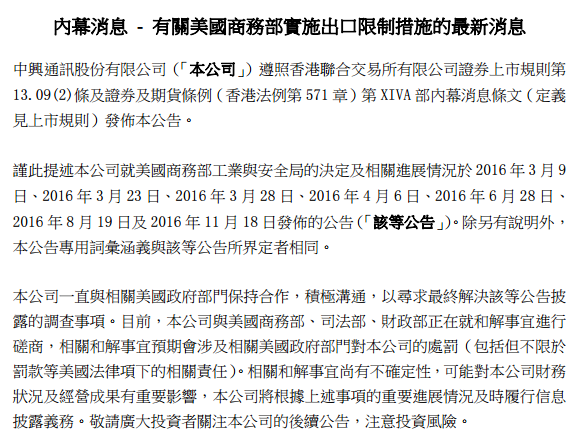 Iccsz訊(編輯:Aiur) 引發(fā)全球關(guān)注的美國(guó)制裁中興事件即將滿一年,但風(fēng)波一直沒(méi)有平息。中興通訊今日在港交所發(fā)布了關(guān)于美國(guó)商務(wù)部實(shí)施出口限制措施的最新消息,稱目前公司繼續(xù)就出口限制與美國(guó)商務(wù)部、司法部、財(cái)政部進(jìn)行和解磋商,磋商內(nèi)容可能與推遲制裁禁令有關(guān)。中興通訊同時(shí)提醒投資者,相關(guān)和解事宜預(yù)期會(huì)涉及相關(guān)美國(guó)政府部門(mén)對(duì)中興通訊的處罰,并且尚有不確定性,可能對(duì)中興通訊財(cái)務(wù)狀況及經(jīng)營(yíng)成果有重要影響。