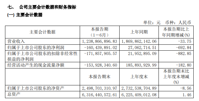 ICC訊 8月28日,江蘇永鼎股份有限公司發(fā)布2020年上半年財務(wù)報告,公司在2020 年 1-6 月營業(yè)收入為12.38億元,比上年同期下降33.75%,歸屬于上市公司股東的凈利潤為-1.6億元,比上年同期下降 692.84%。