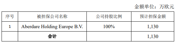 此次擬擔保總金額為 1,130 萬歐元,擔保有效期為 2022 年和 2023 年。具體如下: