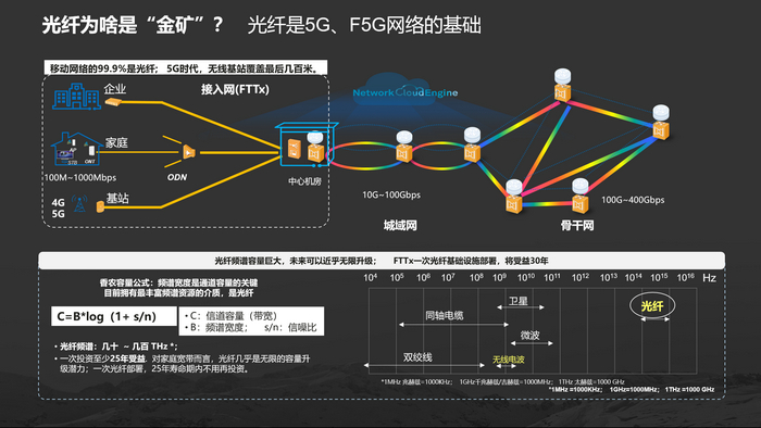 為什么“光纖資產(chǎn)是金礦”?Carol Wang說,光纖是5G、5G&column_id=ALL&station=%E5%85%A8%E9%83%A8" target="_blank">F5G網(wǎng)絡(luò)堅實基礎(chǔ)。對于5G網(wǎng)絡(luò),無線波覆蓋最后幾百米,網(wǎng)絡(luò)99.9%以上是光纖連接;光纖頻譜容量巨大,未來可以近乎無限升級,F(xiàn)TTx一次光纖基礎(chǔ)設(shè)施部署,將受益至少25年以上。
