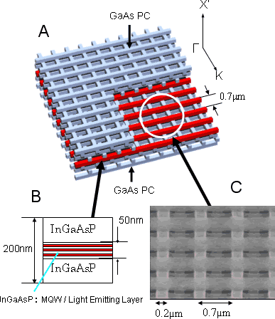 三維光子晶體,是可將光粒封在內(nèi)部的半導(dǎo)體晶體。在埋入以其他半導(dǎo)體材料制作的小球狀物,也可同時聚集電子。此種晶體外部受到光線照射時,晶體內(nèi)的光和電子會重復(fù)地交互作用,使光放大增加,進(jìn)而產(chǎn)生效率極佳的激光。與以往的半導(dǎo)體激光器相比,組件中產(chǎn)生的光能以1000倍左右的高效率提取。