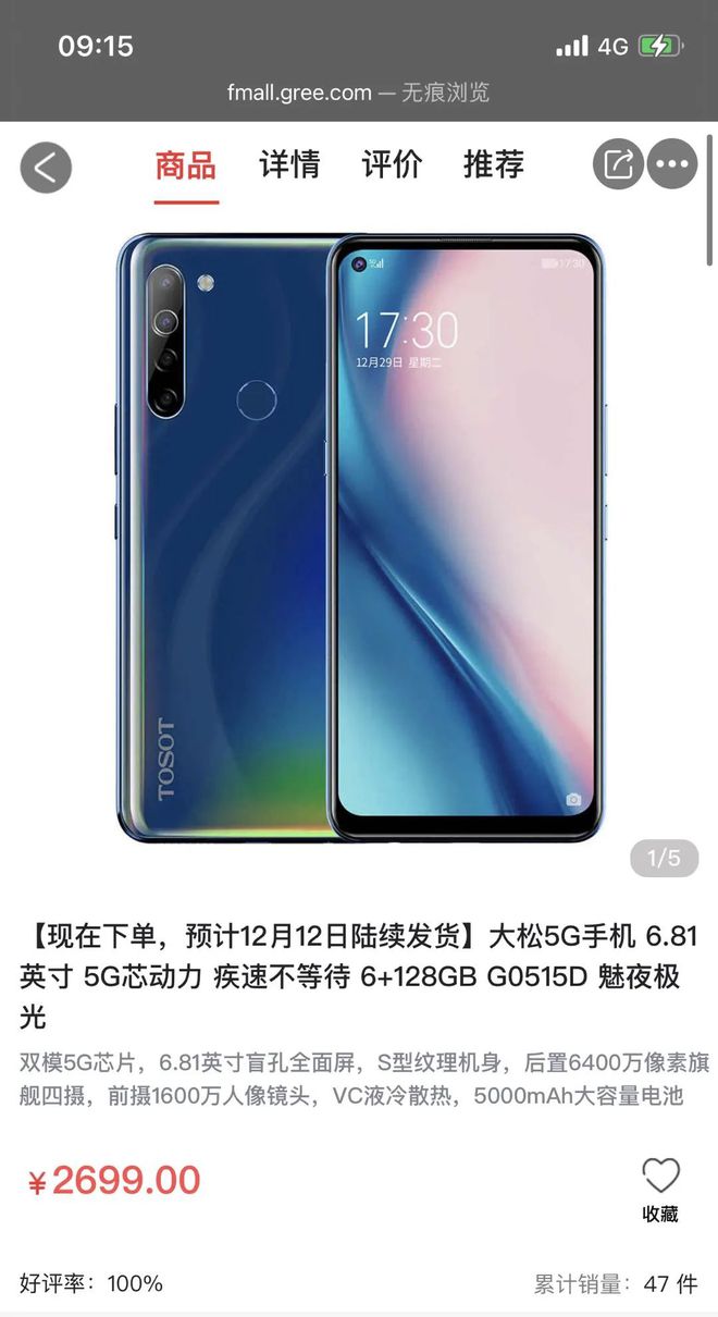 大松5G手機(jī)上架格力董明珠店(圖片來源:格力董明珠店官網(wǎng)網(wǎng)頁截圖)