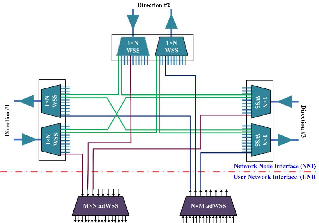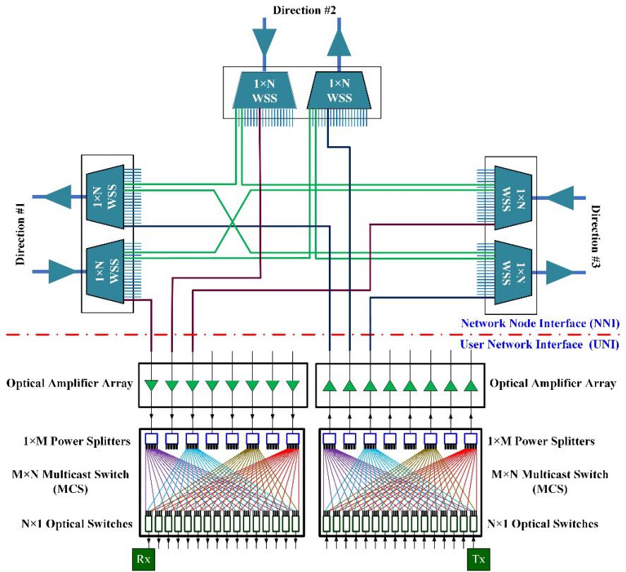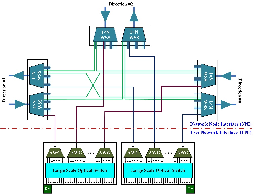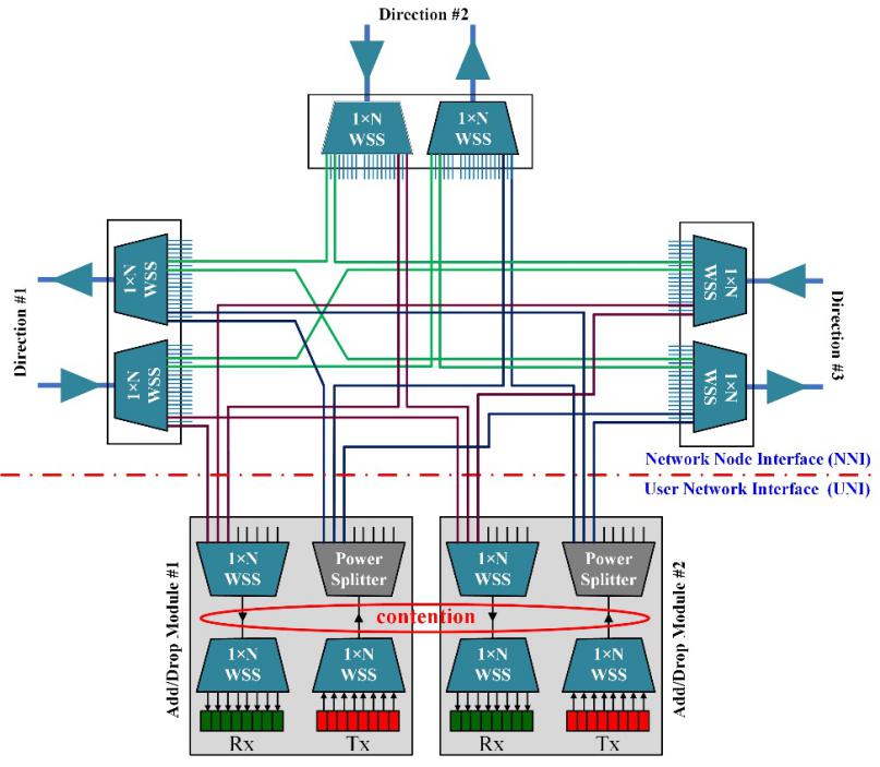 每個ROADM節(jié)點包含一個網(wǎng)絡(luò)節(jié)點接口(NNI)和一個用戶網(wǎng)絡(luò)接口(UNI)。NNI互連來自/去往多個傳輸方向的DWDM信號,這些DWDM信號以波長粒度在各傳輸方向之間切換。UNI以波長粒度下載目的地為本節(jié)點的信號,并從本節(jié)點上傳信號。為了實現(xiàn)無阻塞的波長交換和上/下載,新一代ROADM節(jié)點要求具有無色、無方向性和無競爭(CDC ROADM)的特點。