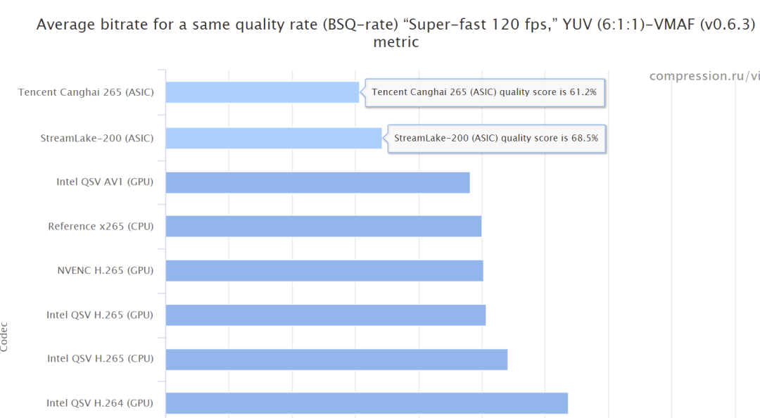 滄海芯片的編碼器設計中完整實現(xiàn)了高精度運動搜索、全率失真優(yōu)化、高效自適應量化等所有主流編碼工具,并融合騰訊云軟件編碼器碼率控制等方面的領先技術,壓縮率高于市面標品35%以上。
