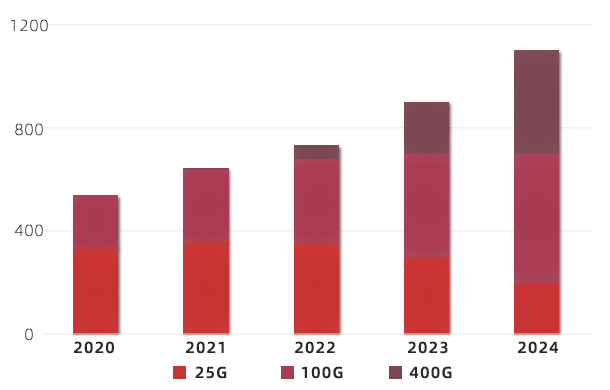 預(yù)計(jì)2021年依然是25G AOC/DAC+100G模塊的市場,但需求量會有所提升,預(yù)計(jì)增長幅度不低于18%。400G SR8有小批量的試樣采購,幾乎可不計(jì)。國內(nèi)云廠商普遍預(yù)計(jì)將在2022年下半年開展 400G的批量采購,并在2023開始進(jìn)入大批量的采購。中國云廠商對25G以上光模塊需求將從2020年的530萬只,增長到2024年的1100萬只。初步預(yù)計(jì)國內(nèi)數(shù)據(jù)中心對400G光模塊的規(guī)模需求應(yīng)該在2022年末。