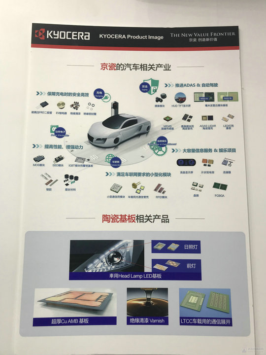 京瓷團隊表示目前公司正提高和加強其它產業(yè)上的應用,特別提到了汽車相關產業(yè),為提供保障充電時的安全高效,提高性能和增強動力,滿足車聯(lián)網(wǎng)要求的小型化模塊,推動ADAS&自動駕駛,大容量信息服務&娛樂項目,目前已擁有整套零部件解決方案。