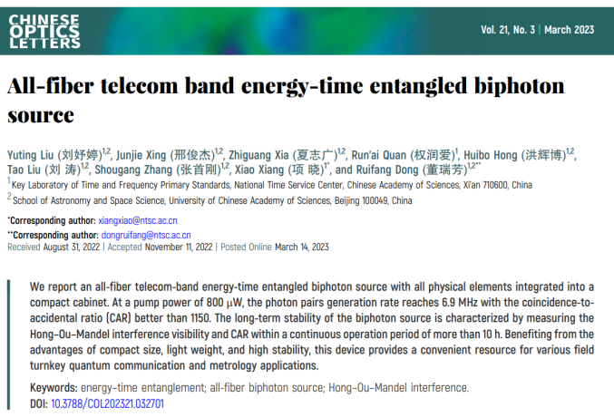 中國(guó)科學(xué)院國(guó)家授時(shí)中心的董瑞芳研究員課題組在Chinese Optics Letters ,2023年第21卷第3期(Y. Liu, et al., All-fiber telecom-band energy-time entangled biphoton source)報(bào)道了一種基于全光纖結(jié)構(gòu)的光通信波段能量-時(shí)間糾纏雙光子源,并被選為當(dāng)期Editors’ Pick。