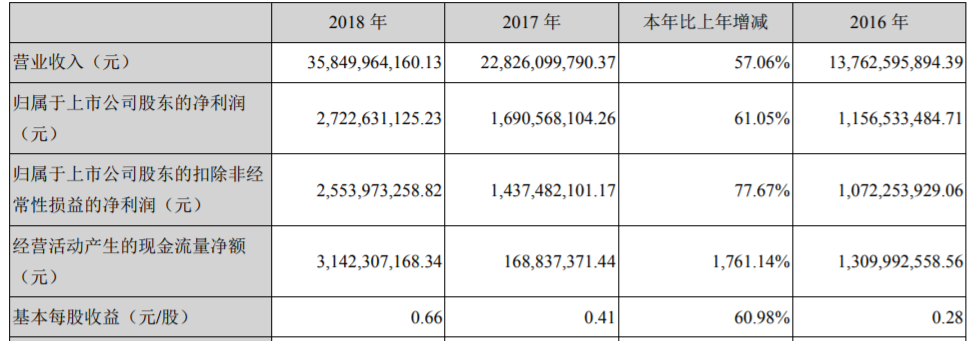 ICCSZ訊 (編輯:Nicole) 立訊精密工業(yè)股份有限公司(以下簡(jiǎn)稱:立訊精密)公布2018年年度報(bào)告:報(bào)告期內(nèi),立訊精密實(shí)現(xiàn)銷售收入358.50億元,較上年同期增長(zhǎng)57.06%;實(shí)現(xiàn)利潤(rùn)總額32.82億元,較上年同期增長(zhǎng)60.99%;實(shí)現(xiàn)歸屬于母公司所有者的凈利潤(rùn)27.23億元,較上年同期增長(zhǎng)61.05%。