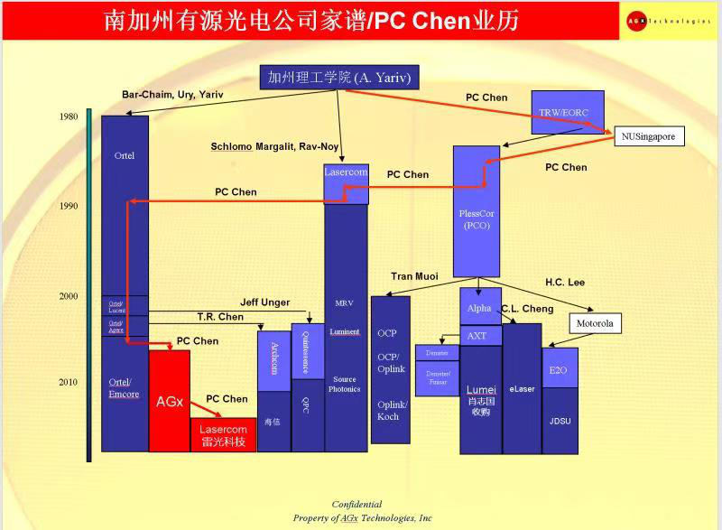在國內(nèi)提起T.R.Chen(人稱陳老師),也許很多光通信同行并不陌生,卻并不知道事實上PC Chen在芯片領(lǐng)域里還是T.R.Chen的大師兄,關(guān)于PC Chen的光榮歷史,可能說上一天也不夠,下面一張南加州有源光電公司家譜,基本呈現(xiàn)PC Chen在光電行業(yè)的腳印,也是其傳奇經(jīng)歷的直觀展示。