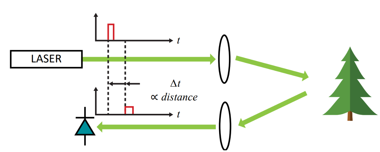飛行時間(TOF)激光雷達使用短脈沖激光,測量光脈沖往返目標的時間。如圖1所示,系統(tǒng)根據(jù)發(fā)射和接收脈沖之間的時間延遲計算距離。TOF系統(tǒng)工作原理: