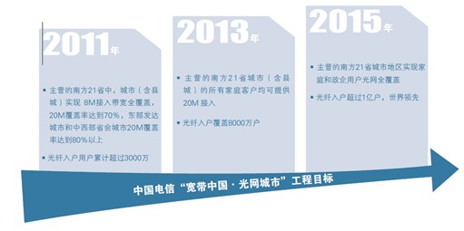 自2011年起,中國(guó)電信就正式啟動(dòng)“寬帶中國(guó)·光網(wǎng)城市”工程,計(jì)劃在3年內(nèi)實(shí)現(xiàn)所有城市光纖化,在3至5年內(nèi)將客戶接入帶寬提升10倍以上,形成一個(gè)包括衛(wèi)星通信、光纖寬帶、移動(dòng)網(wǎng)絡(luò),覆蓋大江南北、惠及全中國(guó)的優(yōu)質(zhì)信息網(wǎng)絡(luò)。