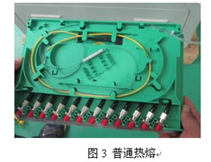 熱熔接熔接成端,如下圖3,實(shí)際上就是將光纜與尾纖分別開(kāi)剝后通過(guò)熔接機(jī)熱熔對(duì)接,對(duì)接完后需要使用熔接盤(pán)進(jìn)行固定保護(hù);