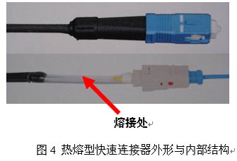 熱熔型快速連接器,如下圖4,實(shí)際上一樣是光纖熔接,只不過(guò)熔接點(diǎn)在連接器尾端內(nèi)部,相當(dāng)于熱熔把尾纖的尾纜給省掉了,這樣做的好處是熔接好后,不需作額外保護(hù)。