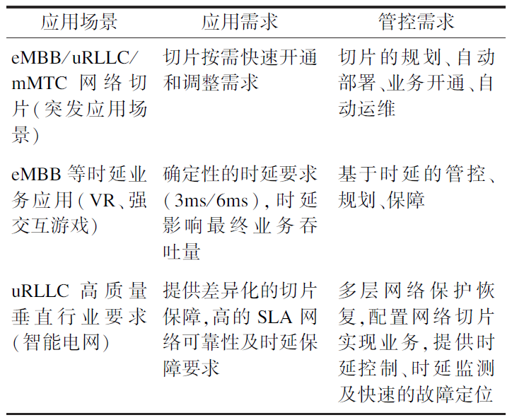不同的5G業(yè)務應用場景帶來了新的端到端業(yè)務協(xié)同管控需求。如表1所示,增強移動寬帶(eMBB)、超高可靠超低時延通信(uRLLC)、海量機器類通信(mMTC)網(wǎng)絡應用場景需要管控系統(tǒng)支持切片的快速創(chuàng)建與調(diào)整,要求管控系統(tǒng)具備切片的規(guī)劃、自動部署、業(yè)務開通及自動運維能力。低時延業(yè)務應用,比如虛擬現(xiàn)實(VR)、強交互性的游戲則要求網(wǎng)絡具備3 ms/6 ms量級的低時延保障,因此要求管控系統(tǒng)具備基于時延的業(yè)務管控、路徑規(guī)劃及業(yè)務性能保障能力;uRLLC高質(zhì)量垂直行業(yè)(如智能電網(wǎng))等應用場景,則要求5G承載網(wǎng)絡提供差異化的切片保障、高業(yè)務等級協(xié)議(SLA)網(wǎng)絡可靠性及時延保障。