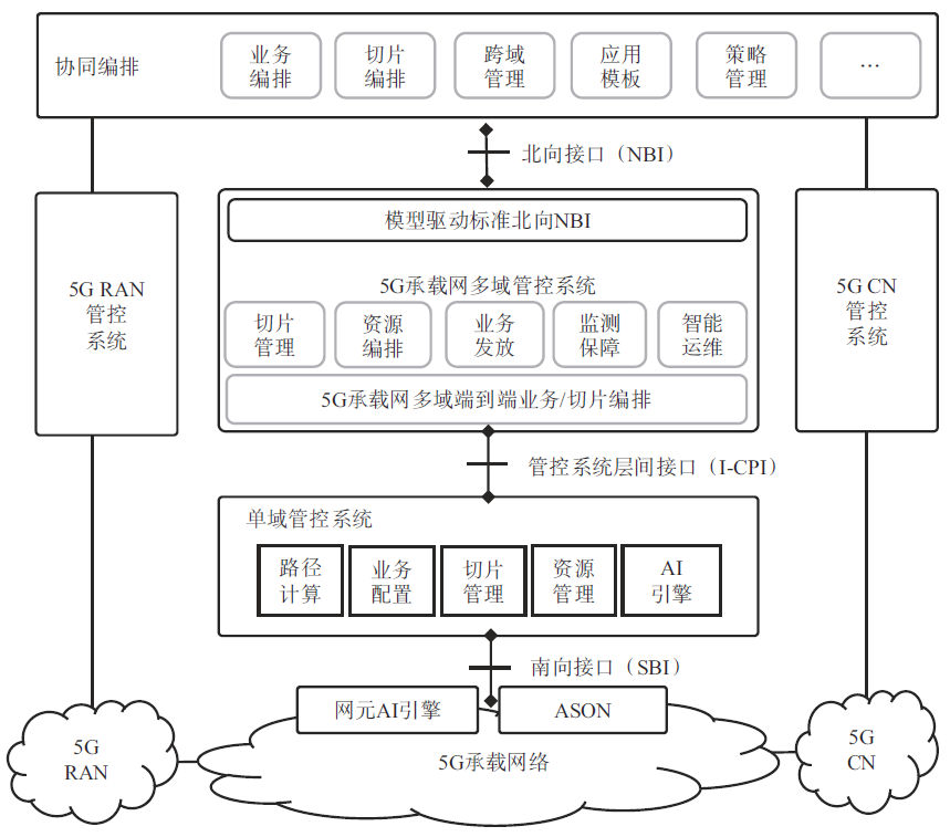 承載網(wǎng)絡端到端協(xié)同管控架構如圖1所示。5G承載網(wǎng)絡管控系統(tǒng)可提供標準的北向接口(NBI),為上層管控系統(tǒng)使用。5G承載管控系統(tǒng)本身分為多域和單域進行多層混合部署,整個管控架構具備可擴展性,并實現(xiàn)多廠商、多區(qū)域之間的業(yè)務編排和切片編排,同時引入人工智能,提升承載網(wǎng)絡切片、業(yè)務發(fā)放和多層網(wǎng)絡運維的效能。