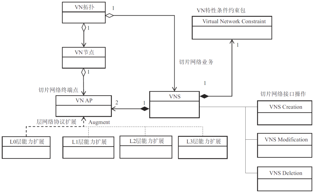 參考IETF、ONF的VN管控模型,在北向接口模型建模過程中,可采用類似圖3的建模方案,該模型采用統(tǒng)一的VN網(wǎng)絡管控模型,定義了VN資源、VN操作接口,實現(xiàn)了網(wǎng)絡切片的拓撲生成,并通過VN特性條件約束包描述網(wǎng)絡隔離、SLA屬性等特性信息,同時還支持網(wǎng)絡切片的創(chuàng)建、刪除、調(diào)整等操作。該方案中的網(wǎng)絡切片能力信息通過層協(xié)議擴展來實現(xiàn)。