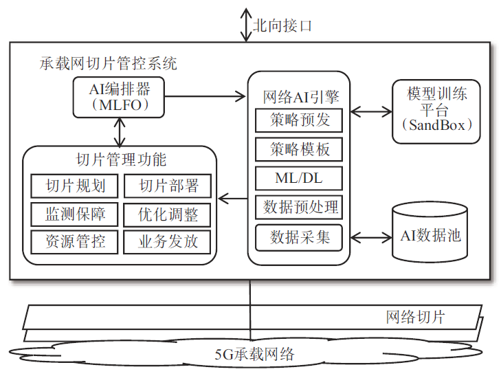 隨著人工智能技術的發(fā)展,可在管控系統(tǒng)中引入人工智能,提升網(wǎng)絡切片的管控效率。在網(wǎng)絡切片規(guī)劃方面,可引入人工智能,進行自動化的業(yè)務編排;在部署調(diào)整方面,可利用人工智能算法,優(yōu)化調(diào)整結(jié)果;在監(jiān)測保障方面,可通過南向接口從底層轉(zhuǎn)發(fā)設備收集設備狀態(tài)與網(wǎng)絡性能相關的監(jiān)測數(shù)據(jù),利用機器學習,分析歷史監(jiān)測數(shù)據(jù),對流量等性能數(shù)據(jù)進行預測,并基于預測的結(jié)果對網(wǎng)絡切片進行實時的調(diào)整和優(yōu)化。