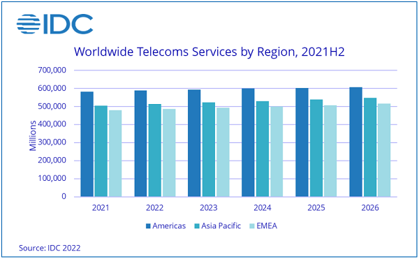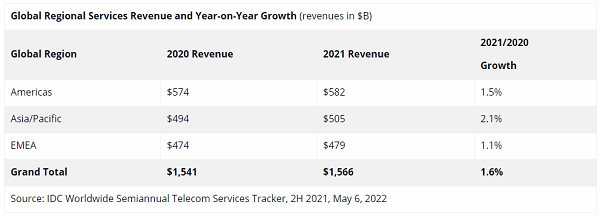 ICC訊(編譯:Nina)根據(jù)IDC全球電信服務半年度跟蹤報告,2021年全球電信服務和付費電視服務支出達到15660億美元,年增幅1.6%。IDC預計,2022年全球電信和付費電視服務支出將增長1.4%,達到15880億美元。