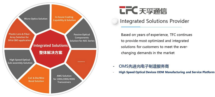 在技術(shù)創(chuàng)新這條路上,天孚通信一直奮勇向前,自2015年公司成功上市后,連續(xù)四年每年研發(fā)投入占當(dāng)年度營收的比例始終在8%以上,公司通過不斷加大研發(fā)投入,豐富產(chǎn)品線組合搭配和垂直整合,依托新建研發(fā)中心優(yōu)勢,借助5G和數(shù)據(jù)中心的快速發(fā)展,陸續(xù)建設(shè)擴(kuò)充了OSA ODM高速率光器件、光隔離器、高密度線纜連接器、光纖透鏡陣列(LENS ARRAY)、BOX/TO封裝、AWG、FA/PM保偏器件等多個新產(chǎn)品線,形成系統(tǒng)競爭優(yōu)勢,深化為光模塊客戶提供多組合、一站式解決方案的核心能力,營業(yè)收入持續(xù)穩(wěn)定增長。 2019年天孚通信在供應(yīng)光學(xué)零組件的基礎(chǔ)上,又提出了OMS光電子制造服務(wù)理念,為客戶提供專業(yè)的產(chǎn)品和服務(wù)。
