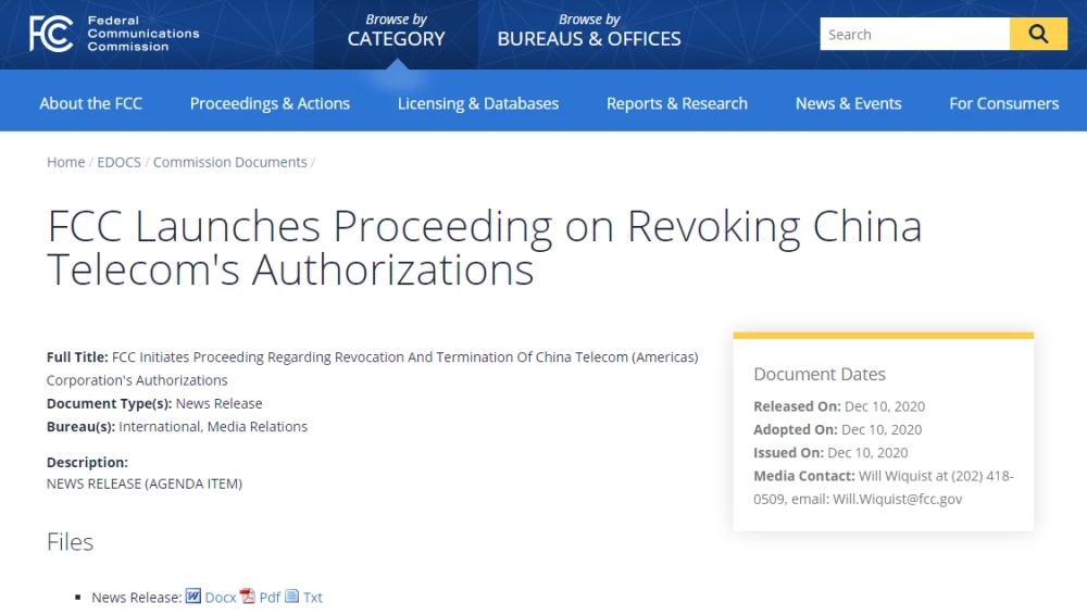 ICC訊 據(jù)路透社報道,美國聯(lián)邦通信委員會(FCC)10日表示,已啟動程序撤銷中國電信在美國提供電信服務(wù)的授權(quán),此舉進(jìn)一步打壓參與美國電信行業(yè)的中國企業(yè)。與此同時,F(xiàn)CC當(dāng)天還駁回了華為技術(shù)有限公司的一份請愿書。華為公司此前請求該機(jī)構(gòu)重新考慮將華為指定為美國“國家安全威脅”的決定。