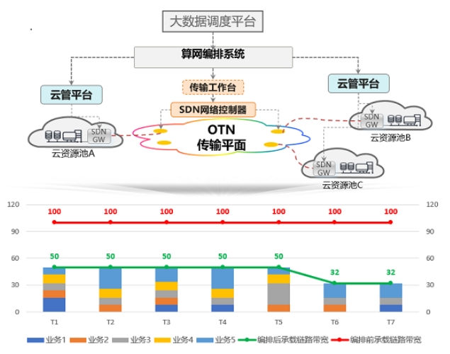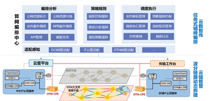中國(guó)移動(dòng)IT云池間互聯(lián)網(wǎng)絡(luò)也同樣面臨這個(gè)問(wèn)題。針對(duì)IT云數(shù)據(jù)中心節(jié)點(diǎn)間TB/PB級(jí)海量數(shù)據(jù)搬移導(dǎo)致的網(wǎng)絡(luò)峰值帶寬訴求高、閑時(shí)帶寬利用率低的現(xiàn)狀,中國(guó)移動(dòng)創(chuàng)新提出在IT云資源池間構(gòu)建基于波分OTN網(wǎng)絡(luò)的超高速、智能彈性的任務(wù)式高品質(zhì)全光運(yùn)力解決方案,聚焦“云數(shù)智傳”和“云鏈智管”的研究與創(chuàng)新。