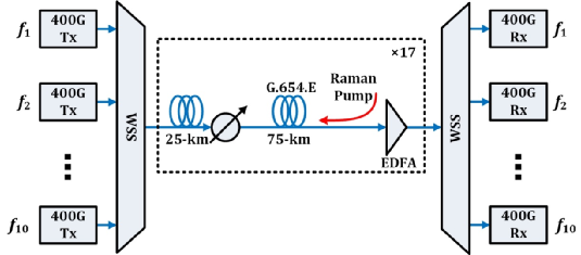綜合優(yōu)化首先通過擴展單載波信號的波特率至約90GBd,聯合概率整形技術可降低等效調制階數,實現約2-3dB的收發(fā)機背靠背性能提升;同時結合超奈奎斯特濾波和碼間串擾補償算法,保證適配100GHz通道間隔,提升傳輸總體頻譜效率;進一步引入超低損耗超大有效模場面積G.654.E光纖替代G.652.D光纖,獲取末端OSNR的增益及全鏈路非線性效應的抑制;最后采用基于EDFA+拉曼的混合放大器,實現了約2.5dB的放大器噪聲抑制。通過聯合使用上述多種技術優(yōu)化手段,最終實現了在超長距1700km G.654.E光纖鏈路上傳送10路400G超高速OTN信號。