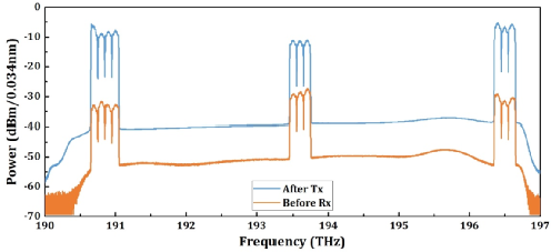 發(fā)射端與1700km傳輸后10×400G信號光譜圖