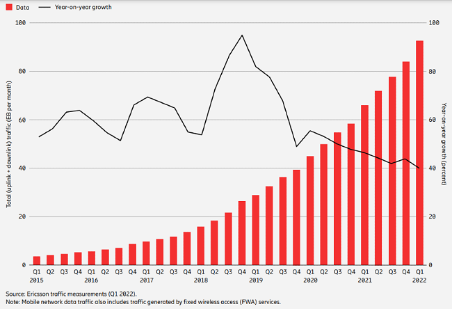該公司最新《移動性報告》(Mobility Report)稱,從2021年第四季度到2022年第一季度,全球移動網(wǎng)絡(luò)數(shù)據(jù)流量增長了10%。與去年同期相比,增幅高達(dá)40%。從絕對數(shù)字來看,全球移動網(wǎng)絡(luò)數(shù)據(jù)流量在短短兩年內(nèi)(自2020年第一季度以來)翻了一番。