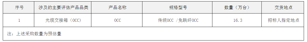 ICC訊 (編輯:Nicole) 中國電信啟動2021年OCC產品集采項目(資格預審編號:HQZGYS202011300001),采購內容為中國電信集團有限公司和中國電信股份有限公司及其下屬子公司、分公司在2021年至2022年各工程中所需的光纜交接箱(OCC)產品共16.3萬臺。