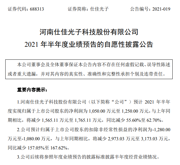 ICC訊 (編輯:Nicole) 河南仕佳光子科技股份有限公司(以下簡(jiǎn)稱“仕佳光子”或“公司”)發(fā)布2021 年半年度業(yè)績(jī)預(yù)告:預(yù)計(jì)2021 年半年度實(shí)現(xiàn)歸屬于上市公司股東的凈利潤(rùn)為 1,050.00 萬(wàn)元至 1,250.00 萬(wàn)元,與上年同期相比,將減少 1,565.11 萬(wàn)元至 1,765.11 萬(wàn)元,同比減少 55.60%至 62.70%;預(yù)計(jì)歸屬于上市公司股東的扣除非經(jīng)常性損益的凈利潤(rùn)為-1,280.00 萬(wàn)元至-1,080.00 萬(wàn)元,與上年同期相比,將減少 2,973.03 萬(wàn)元至 3,173.03 萬(wàn)元,同比減少 157.05%至 167.62%。
