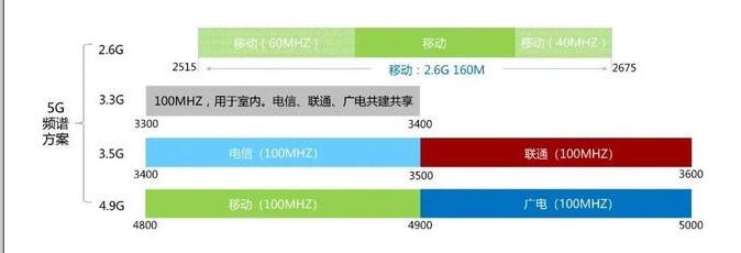 中國(guó)移動(dòng)獲得2515-2675Mhz的160MHz帶寬及4.8-4.9Ghz的100MHz帶寬、中國(guó)電信獲得3.5GHz頻段(3400MHz-3500MHz)、中國(guó)聯(lián)通獲得3.5GHz頻段(3500MHz-3600MHz)、中國(guó)廣電獲得4.9GHz頻段(4900MHz-5000MHz)。