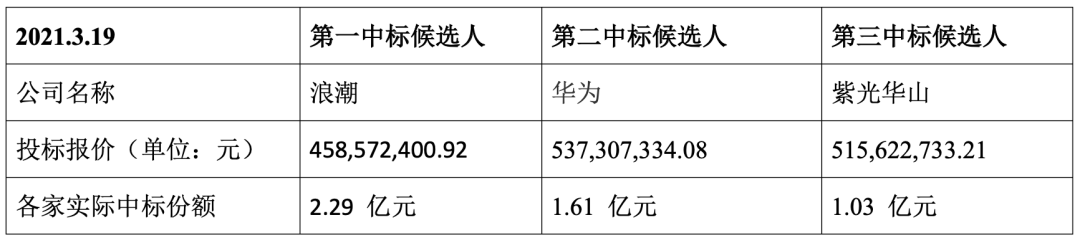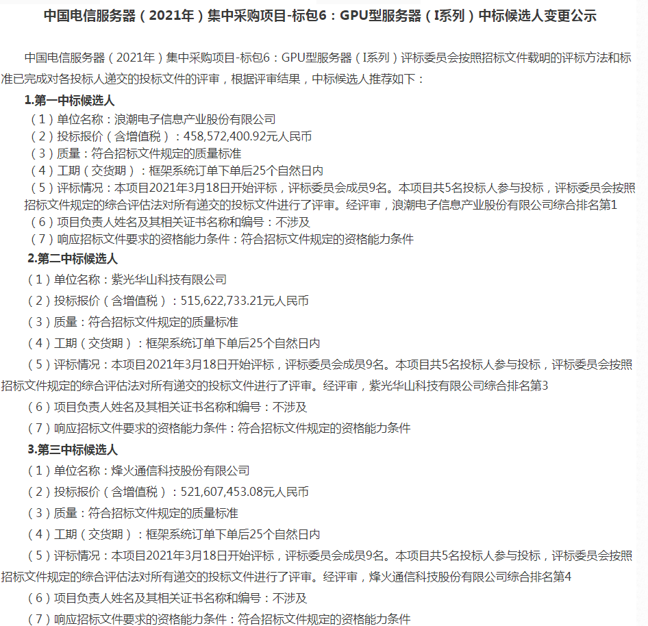 ICC訊 2021年3月19日,中國電信發(fā)布服務(wù)器(2021)集采(標(biāo)包6-GPU型服務(wù)器I系列)中標(biāo)候選人公示,采購數(shù)量2767臺(tái)(報(bào)價(jià)含增值稅)。2021年6月16日中標(biāo)候選人變更公示發(fā)布:浪潮電子仍為第一中標(biāo)候選人,華為放棄1.61 億元大單,紫光華山變更為第二中標(biāo)候選人,烽火通信為第三中標(biāo)候選人。