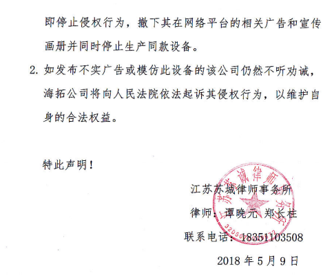 海拓儀器律師聲明:反對(duì)侵權(quán)行為 維護(hù)公司和消費(fèi)者權(quán)益