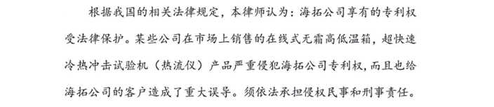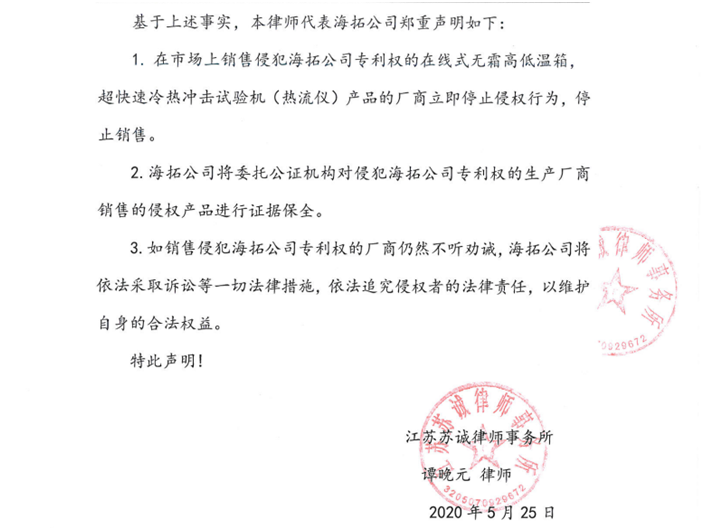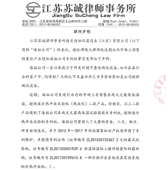 近期,海拓公司發(fā)現(xiàn)行業(yè)內(nèi)的市場上有銷售在線式無霜高低溫箱,超快速冷熱沖擊試驗機(jī)(熱流儀)二款產(chǎn)品。江蘇蘇誠律師事務(wù)所接受海拓公司委托,并根據(jù)我國的相關(guān)法律規(guī)定,發(fā)表聲明表示海拓公司享有二款產(chǎn)品的專利權(quán),并受法律保護(hù)。聲明詳情如下: