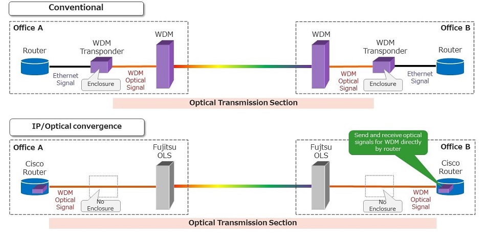 新的配置消除了對(duì)安裝WDM應(yīng)答器的外殼的需求,從而降低了功耗,并節(jié)省了設(shè)備安裝空間。WDM應(yīng)答器被微型化成一個(gè)光模塊并安裝在Cisco路由器中。通過(guò)改進(jìn)半導(dǎo)體制造工藝,光模塊本身已優(yōu)化為低功耗。
