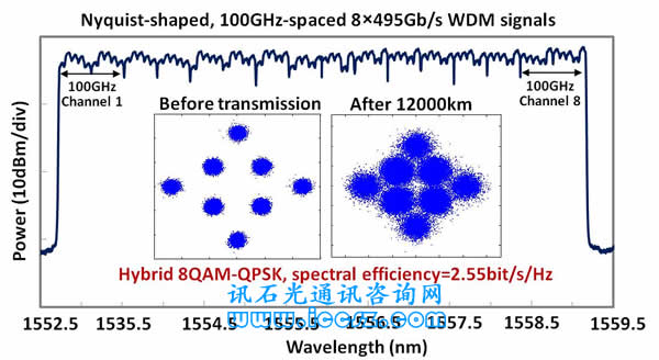 8個100GHz間隔的495Gb/s WDM信號光頻譜測量圖,包括光纖傳輸前后的測量結果。