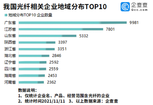 企查查數(shù)據(jù)顯示,從區(qū)域分布來(lái)看,廣東以9981家光纖相關(guān)企業(yè)排名第一,江蘇省、山東省分別有7801家、5332家光纖相關(guān)企業(yè),排在第二、三名。此后依次為陜西省、浙江省、湖北省等。