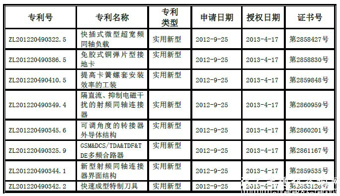 第七項(xiàng)“新型射頻同軸連接器界面結(jié)構(gòu)”公開了一種新型射頻同軸連接器界面結(jié)構(gòu),包括外導(dǎo)體、護(hù)套、內(nèi)導(dǎo)體,其特征在于,所述外導(dǎo)體的一端為帶M29X1 螺紋的接口,所述護(hù)套是一種性能穩(wěn)定的高彈性合金塑料,所述內(nèi)導(dǎo)體的一端為開了槽的彈片,所述護(hù)套為采用性能穩(wěn)定的高彈性合金塑料,位于外導(dǎo)體和內(nèi)導(dǎo)體之間且用于包裹內(nèi)導(dǎo)體,本實(shí)用新型能與IEC 60169-4, VG 95250, EN 122190,CECC22190,DIN 47233 五種標(biāo)準(zhǔn)互配的連接器界面,可用于無線電設(shè)備、室內(nèi)分布系統(tǒng),射頻發(fā)射機(jī)和接收機(jī)等互連用的連接器。