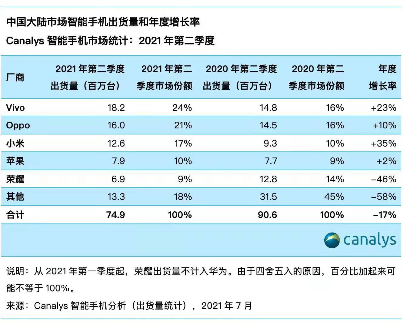 ICC訊 市場研究機(jī)構(gòu)Canalys發(fā)布的最新報(bào)告數(shù)據(jù)顯示,2021年第二季度中國大陸智能手機(jī)市場出貨量達(dá)到7490萬臺(tái),同比下降17%。其中,千萬臺(tái)以上出貨量廠商由5家縮減至3家。