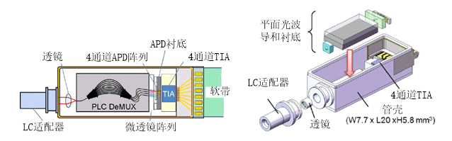 下一代100G 客戶側光收發(fā)模塊—CFP2的體積將減小到目前的三分之一,功耗將減小為當前的一半,傳統(tǒng)的分立光電器件已難以滿足這種需求,基于集成技術的4×25Gb/s光發(fā)射組件TOSA和光接收組件ROSA應運而生。NTT的研究小組利用單片集成和混合集成技術分別實現(xiàn)了小型化的TOSA[3]和ROSA[4]器件,如圖4和圖5所示。